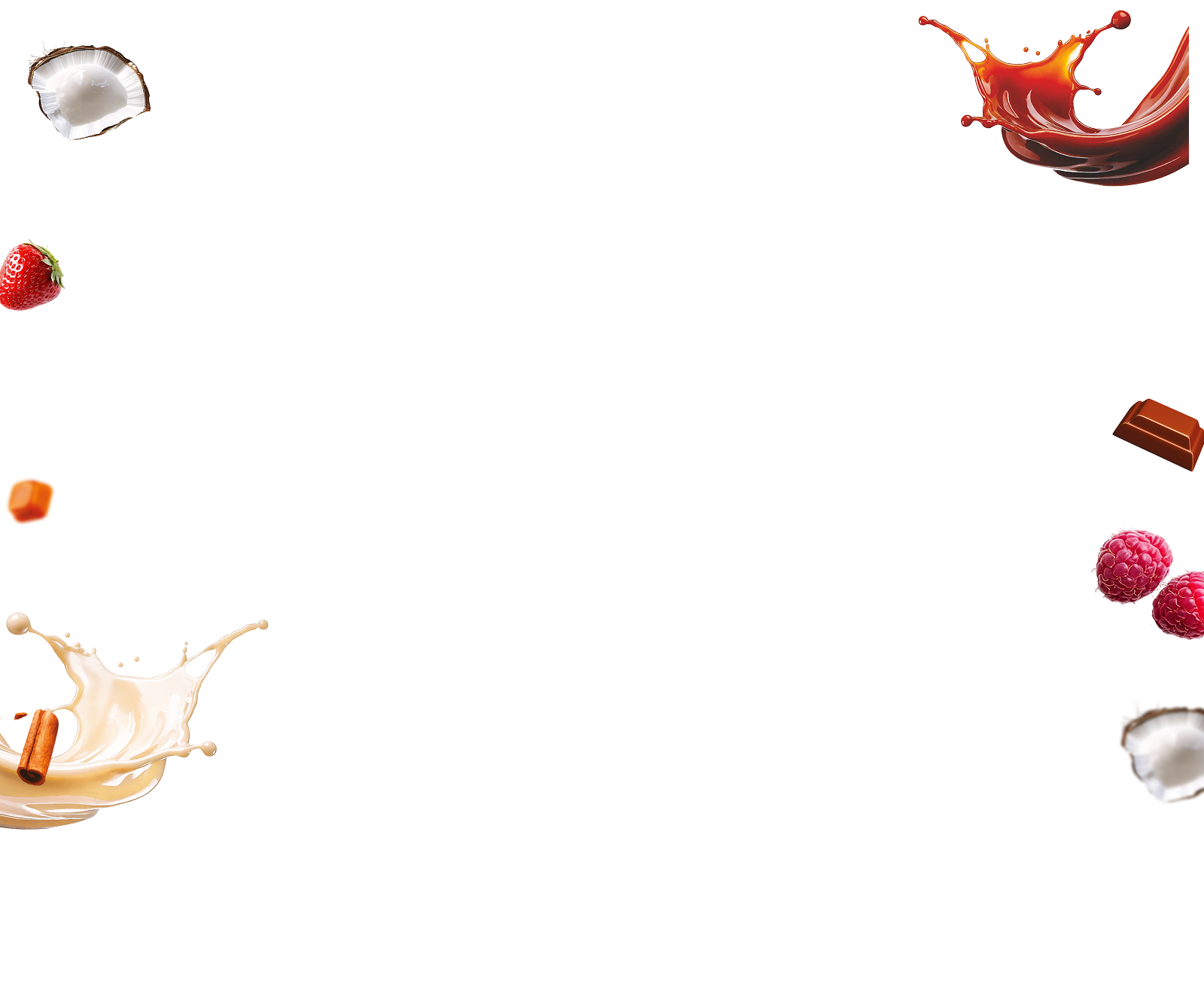 Floating Just Whey packages in various flavours with a chocolate splash and fruit accents.