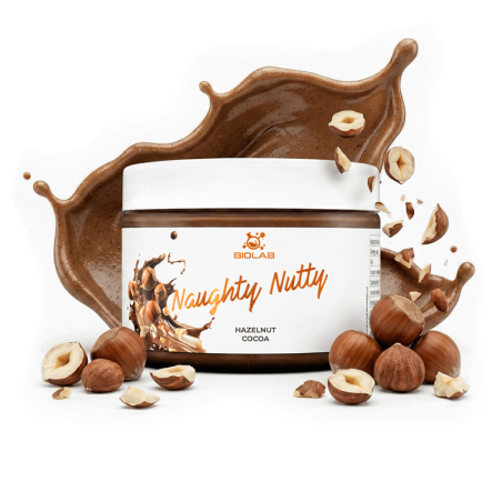 Naughty Nutty Hazelnut Cocoa – Ingredients: roasted peanuts (40%), sweetener: maltitol, roasted hazelnuts (15%), shea oil, fat-reduced cocoa (7%), emulsifier: lecithins, natural flavourings.