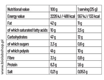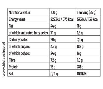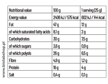 A texture that makes a difference - salted caramel with crunchy nut pieces is an unconventional treat for the palate. An extra portion of fibre supports digestion and gives a feeling of satiety, and the distinctive structure means even a small portion delivers full satisfaction from the taste.